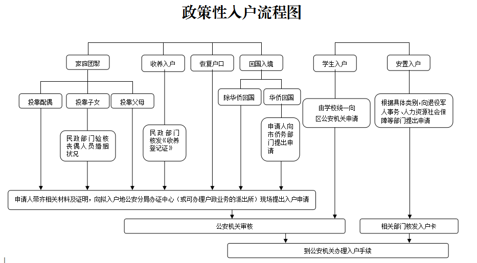 市(區)公安機關負責按計劃辦理家庭團聚、學生入戶、收養入戶、恢復戶口、回國(入境)定居的入戶審核工作,辦理各類人員的入戶手續。