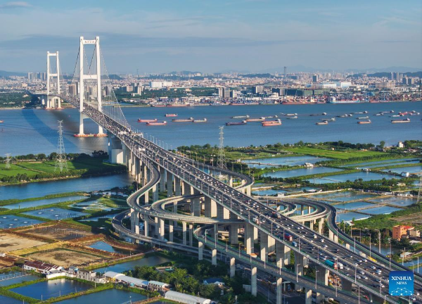 An aerial drone photo taken on October 2, 2024 shows a view of an interchange overpass on the Nansha Bridge, which links Guangzhou city and Dongguan city, in Haiou Island of the Pearl River Estuary area in Guangzhou, South China's Guangdong province.