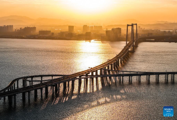 This photo taken on December 7, 2024 shows a view of Gaolan Port Bridge (with twin main towers on the left) and Huangmao Sea Channel Bridge (with three main towers on the right) in South China's Guangdong province.