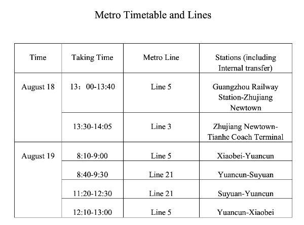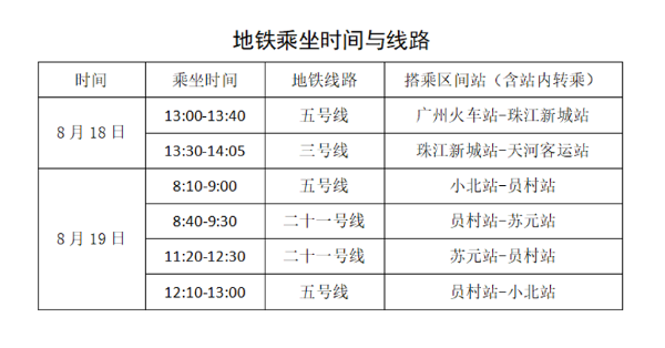 If you have taken Guangzhou Metro Line 3, Line 5, Line 21 or transferred at the corresponding stations during the following periods of time on August 18 and 19, please report to your community and complete two nucleic acid tests within three days.
