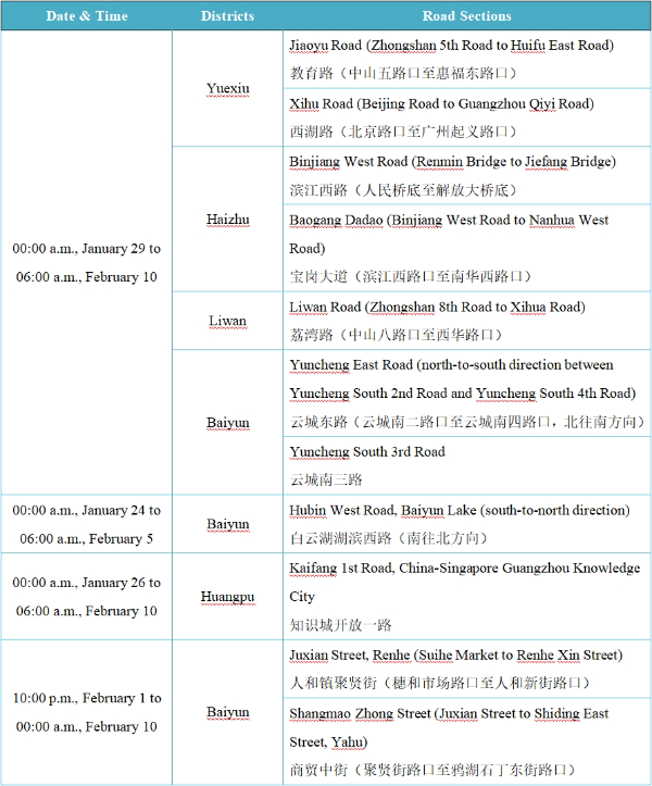 To ensure the safe and successful holding of the flower markets, traffic police in Guangzhou have been implementing traffic control measures in the following road sections. Vehicles have been prohibited from passing through these sections, in accordance with the relevant provisions of the Law of the People's Republic of China on Road Traffic Safety.
