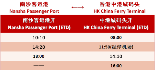 Sailing schedule for the route from Nansha Passenger Port to HK China Ferry Terminal:
