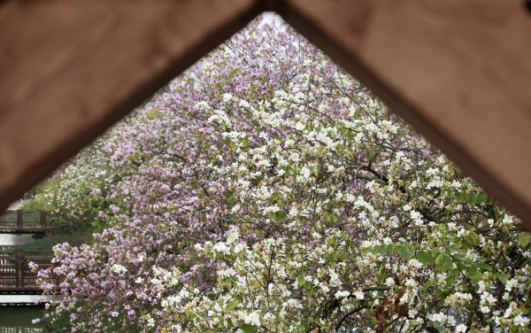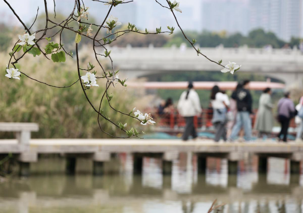 Along a 3.2-kilometer road inside the Haizhu Wetland, a national-level wetland park in the city's Haizhu district, bauhinia trees are blooming right on schedule, forming a white and pink flower sea.