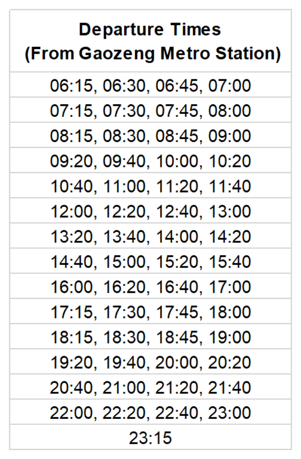 Get off at Gaozeng Station and transfer to the free T3 shuttle bus. The journey is about 6 km and takes 15 minutes, with services every 15-20 minutes.