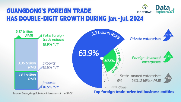 The foreign trade in Guangdong province has maintained robust growth in the first seven months of 2024, with the total value of imports and exports reaching 5.17 trillion RMB, marking a 13.9% increase year on year, according to data released by the Guangdong Sub-Administration of the GACC on August 12. This growth rate surpasses the national average by 7.7 percentage points, with Guangdong accounting for 20.8% of the country's total foreign trade.