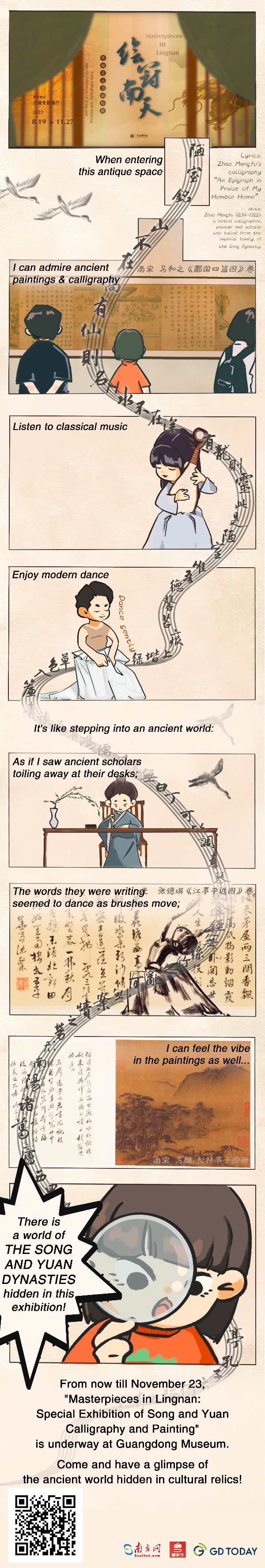 In Guangdong Museum, there is an exhibition where you can see over 50 pieces (sets) of paintings and calligraphy in the Song and Yuan dynasties while enjoying dance performances and classical pieces with traditional Chinese instruments guqin, xiao and pipa.