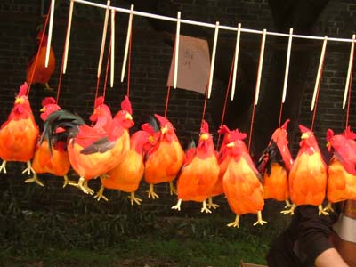 Legend has it that in ancient times, there lived a old woman surname Zhang near the Boluo Temple. She kept a very vigorous and crowing rooster. A rich landlord, who was fond of rooster fighting, intended to buy the old woman’s rooster at a high price. The old woman refused. The landlord sent his servants to steal the rooster. Unexpectedly, the rooster stopped crowing. In a rage, the landlord had it killed. Deeply saddened, the old woman picked up all its feathers and brought them home. She made a rooster with yellow mud and paper, pasting all the feathers on it. The next morning, the paper rooster crowed like a real one. Delighted, the old woman made plenty of paper rosters and put them on sales in a local market during the Boluo Festival. Such is the tradition of boluo chicken.