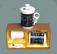 Chen Clan Academy Color-changing Mugs, themed around the decorative arts of Guangzhou's Chen Clan Academy, are newly developed specialty tourist products with both utilitarian and artistic merits. The mugs depict the frontal panoramic view of the Chen Clan Academy. When hot water is poured into a mug, the depiction of the panoramic view of the Chen Clan Academy will disappear, gradually replaced by the Academy's door god and an inscription of a poem by Mr. Guo Moruo eulogizing the Academy. The inscription is in the handwriting of Li Zhuoqi, Curator of the Guangdong Folk Art Museum. The mugs are immensely popular among overseas tourists.