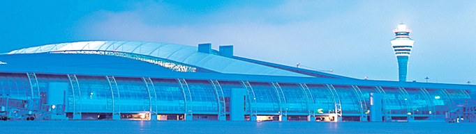 The roof of the main building is designed into a two-tier curved roof design laid out with different curvatures. The shape of the roofs with different heights looks as if a great hawk were spreading its wings. The tensioned materials used for the higher roof is transparent, forming a long skylight in the main building and echoes through with similar smaller glass skylights in the external verandah structures.. These roofs absorb natural light for the airport; and at certain times of the day the rays of sunlight in turn create a wonderful visual experience on the interior support walls creating a marvelous display of changing light and shadow for travelers, turning the airport into a light and graceful crystal city in the evening.