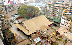 The construction area of the Temple totals 1,200 square meters and ranks still No. one in Lingnan. Although weather-stricken for over 300 years, its style and features are still extant. Its Great Buddha's Hall faces south with the quality wood donated by An'Nan King (now Vietnam) as the beams and columns, which is basically in good condition to this day.