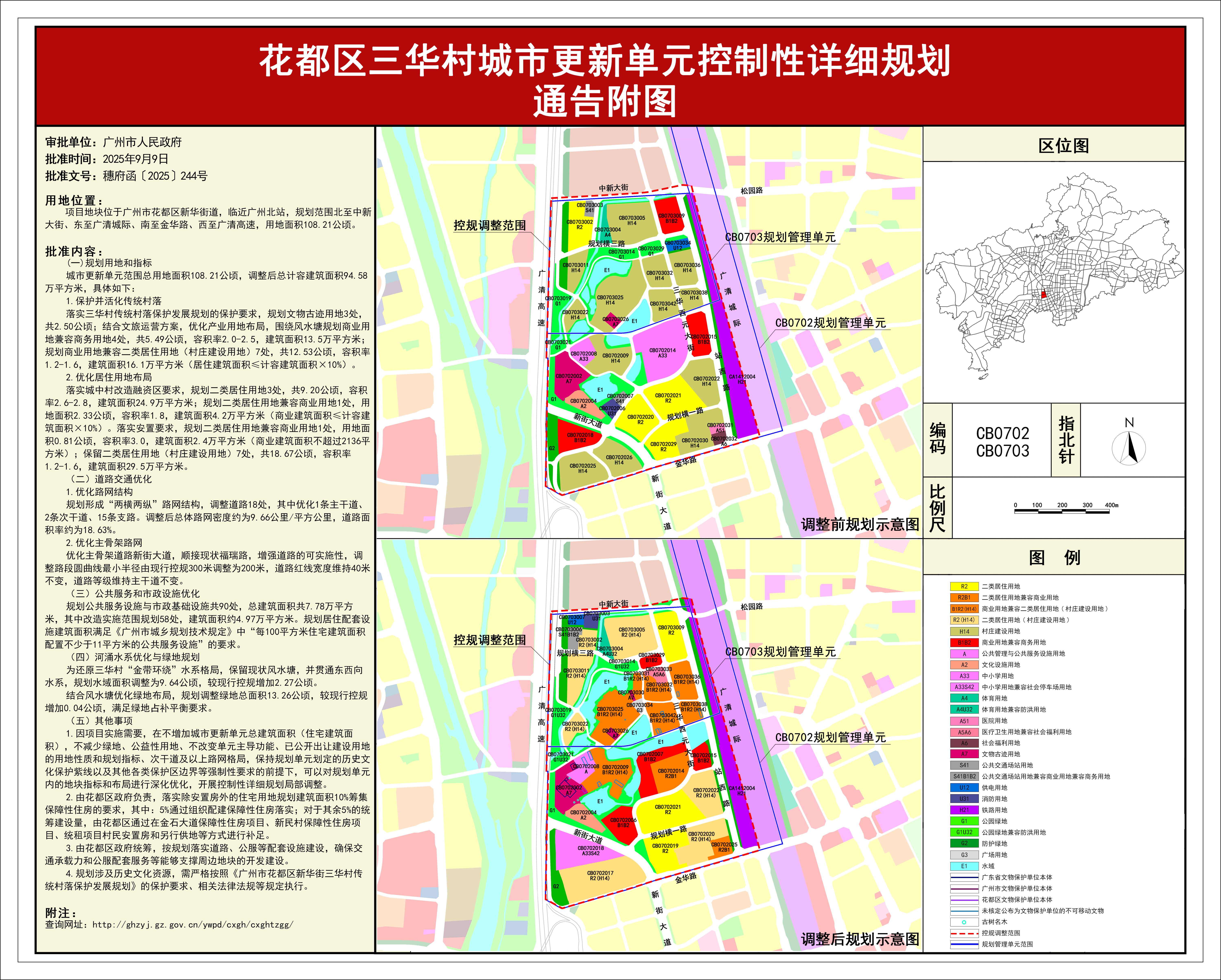 根據《廣東省城市控制性詳細規劃管理條例》,《荔灣區山村片區控制性詳細規劃》《荔灣區花地大道以東儲備地塊(AF0216 規劃管理單元)控制性詳細規劃》《天河區龍洞鳳凰片區生命健康產業園、國際教育園及春崗立交南側組團(AT0102、AT0103、AT0104、AT0105、AT0107、AT0108、AT0109、AT0118、AT0119、AT0201、AT0202、AT0213規劃管理單元)控制性詳細規劃》《白云區興太三路北側政府儲備地塊及留用地(AB4001、AB1404規劃管理單元)控制性詳細規劃》《白云區白云站-白云新城地區GZBY2802、GZBY2903單元詳細規劃》《花都區三華村城市更新單元控制性詳細規劃》《花都區平西村、新和村城市更新單元控制性詳細規劃》《天河區航天奇觀一期北AT1003060地塊建筑高度優化》《華南理工大學科技創新大樓(二期)地塊(天河區AT0504規劃管理單元)控制性詳細規劃局部調整》《黃埔區高能飼料廠及周邊政府儲備用地(AG0406 規劃管理單元)控制性詳細規劃局部調整》10項規劃成果已完成編制、審查、公示等程序,由廣州市規劃委員會審議通過后經廣州市人民政府批準(穗府函〔2025〕244號),自批準之日(2025年9月9日)起生效。