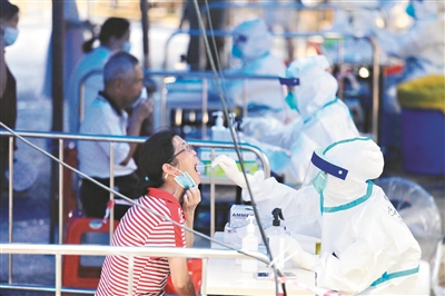 在洛浦街道麗江花園漁人碼頭核酸采樣點,醫(yī)護人員高溫下穿著防護服為居民做核酸采樣