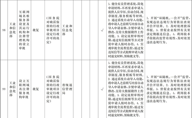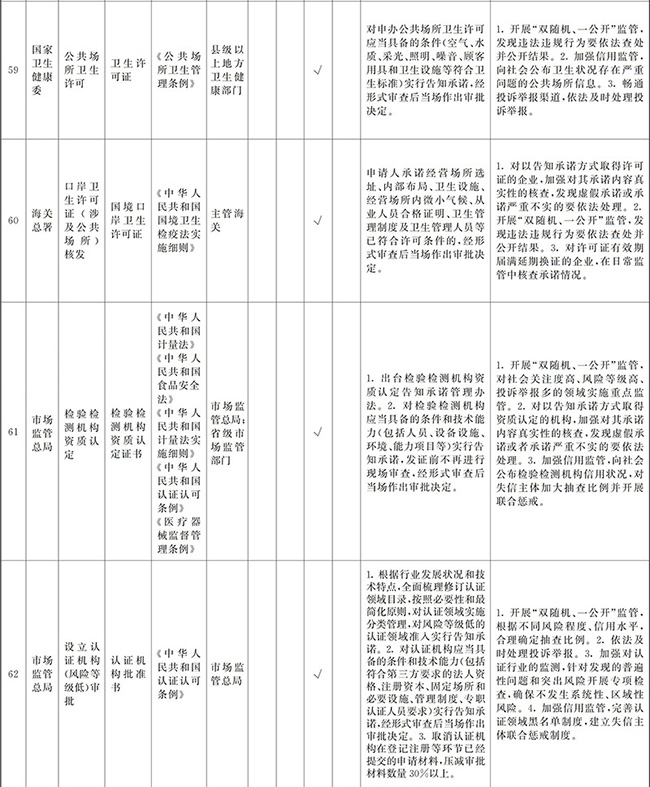 (四)創新和加強事中事后監管。要堅持放管結合、并重,按照“誰審批、誰監管,誰主管、誰監管”原則,加強審批與監管的銜接,健全監管規則和標準,堅決糾正“不批不管”、“只批不管”、“嚴批寬管”等問題。要全面推行“雙隨機、一公開”監管、跨部門聯合監管和“互聯網+監管”,對新技術、新產業、新業態、新模式實行包容審慎監管,對高風險行業和領域實行重點監管。要加強信用監管,依法查處虛假承諾、違規經營等行為并記入信用記錄,實行失信聯合懲戒。要強化社會監督,依法及時處理投訴舉報,引導社會力量參與市場秩序治理。要增強監管威懾力,對嚴重違法經營的企業及相關責任人員,依法撤銷、吊銷有關證照,實施市場禁入措施。