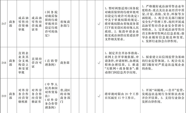 (一)直接取消審批。對設定必要性已不存在、市場機制能夠有效調節、行業組織或中介機構能夠有效實現行業自律管理、通過事中事后監管能夠有效規范的涉企經營許可事項,直接取消審批。