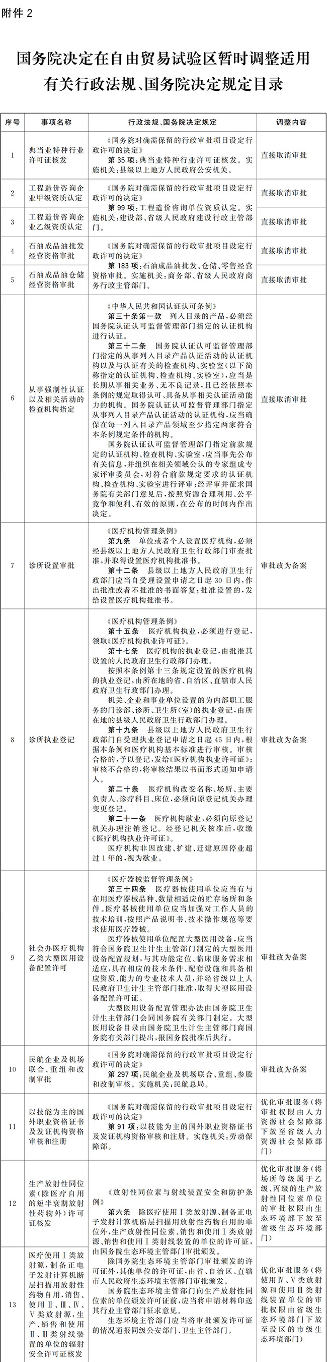 2.國務院決定在自由貿易試驗區暫時調整適用有關行政法規、國務院決定規定目錄