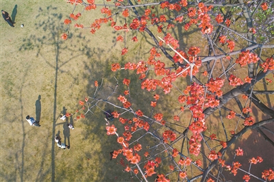 每年的三四月份,春日回暖,木棉花就會開滿梢頭。然而,今年進入二月,廣州大街小巷的木棉花就已競相開放,一朵朵木棉花火紅如炬、俏立枝頭,一片片絢麗的艷紅在春風中悠然搖曳。