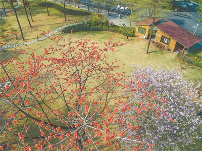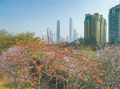 街道上,一幢幢高樓大廈和一棵棵挺拔木棉相映成趣,成排的花樹與筆直的道路一齊延展,構成一幅幅和諧唯美的畫面。公園里,三五成群的年輕人專程前來拍照、打卡,牽著孩子,扶著老人,在怒放的木棉樹下留下最燦爛的笑容。