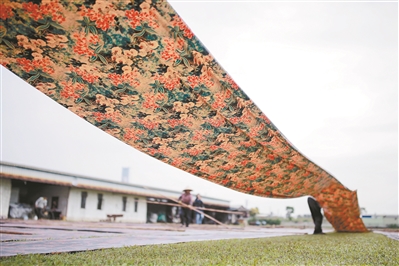 香云紗是一種采用植物染料薯莨染色的絲綢面料,生產(chǎn)時必須具備薯莨、河泥、草地和陽光四大要素,因繁復的制作工藝和特殊的絲綢質感,享有“軟黃金”美譽。作為典型的嶺南沙田水鄉(xiāng),欖核鎮(zhèn)擁有以上四大要素,出產(chǎn)的香云紗成品遠銷四方,多次登上國際時尚大舞臺。如今,一片廣袤的草地上鋪滿紅褐色綢緞,這一生產(chǎn)香云紗的場景已成為欖核鎮(zhèn)一道亮麗的風景線。