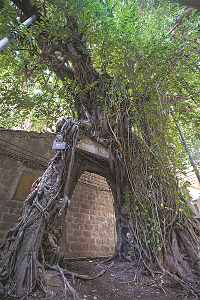 記者看到,如今門樓僅存一塊刻著“東溪”二字的石牌匾和撐起石牌匾的、兩條用泥土和少量磚壘筑而成的門框。石牌匾被榕樹懸空“抓住”,石牌的“東”字已被樹干纏住看不見了。而泥土門框則被細葉榕牢牢地包裹著。正因如此,這棵古樹的樹干基部形成一個“門”字。