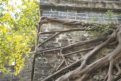 榕樹:根須依附城墻攀爬,從垛口處開始生長,距離地面6米多。