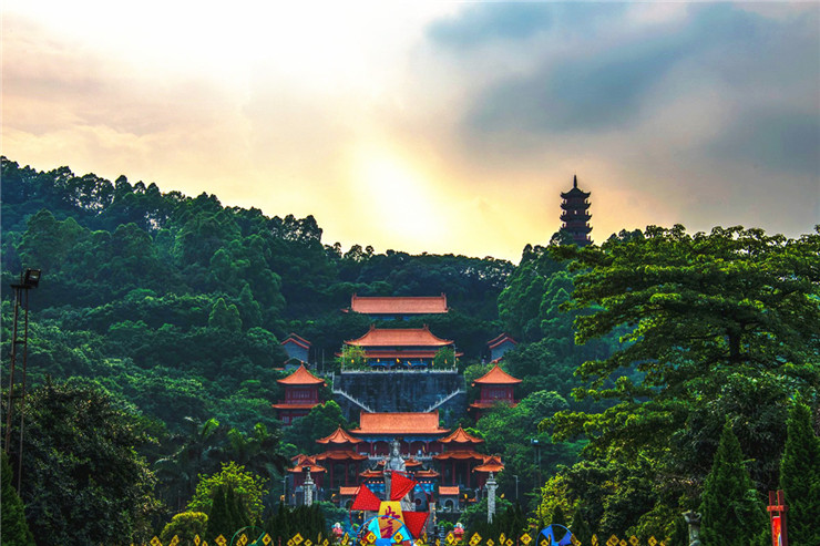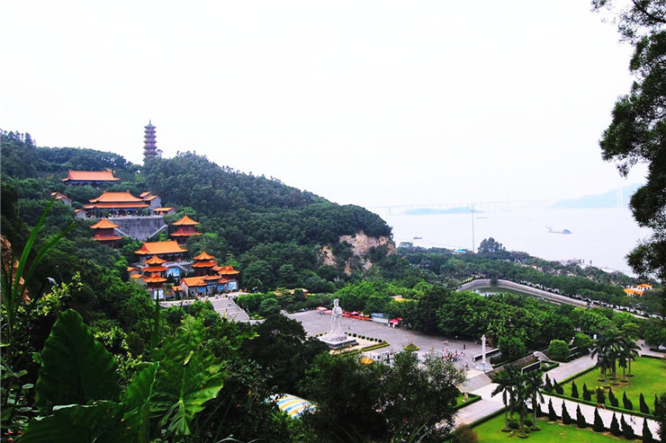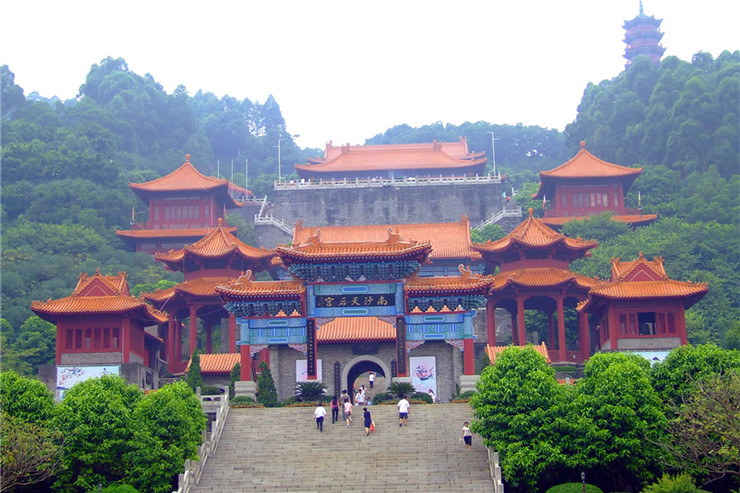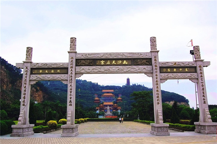 重建的南沙天后宮坐落于南沙大角山東南麓,面對煙波浩淼的伶仃洋。1.5公頃的廣場上矗立著美麗善良的巨型天后圣像。建筑的特點則集北京故宮的風格和南京中山陵的氣勢于一體,其規模是現今世界同類建筑之最、是東南亞最大之媽祖廟。