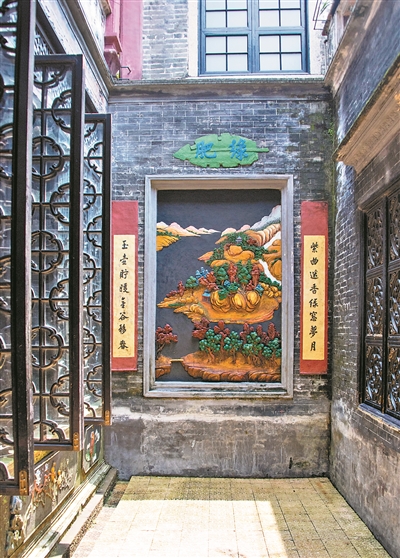 走在余蔭山房的園林里,滿目盡是灰塑,脊飾、照壁、門墻楣、楹聯(lián)、花盒、花基、落水管道,無處不在。在深柳堂西側(cè)巷內(nèi),記者見到一幅《山行圖》,由于巷子寬不足一米,連走路都困難,更不用說站在正面欣賞,但工匠還是把圖當成位于中堂的作品來處理,配有灰塑對聯(lián)和額題。此外,灰塑還可與門框、窗框搭配,成為整體的裝飾,如臨池別館就有以蝠鼠吊如意配圓窗。