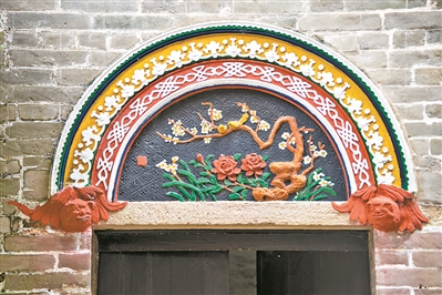 據(jù)介紹,灰塑作品并不全都是彩色的,為適應(yīng)建筑風格需要,采用“素胎”的表現(xiàn)形式反而更為引人注目。如余蔭山房二門門額《壺爵祿成》,花基上百幅的花鳥、山水、文玩題材灰塑飾面,均體現(xiàn)出高雅的審美意趣?!八靥ァ憋L到了民國期間更為流行,此時受西方文化影響,灰塑匠人會將拱形門、羅馬柱等裝飾元素融合到傳統(tǒng)灰塑圖案當中,形成中西文化交融的美感,因此瑜園整體建筑的灰塑風格都以“素胎”為主。