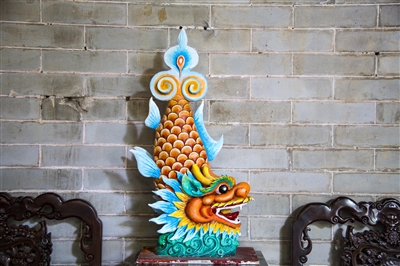 祥禽瑞獸題材:善言鄔公祠脊飾上有龍鳳與魚躍組合的《天倫圖》、瑞犬與麒麟組合的《紅麟拱日圖》。