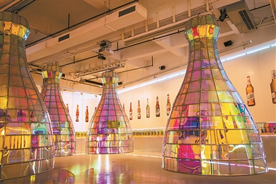 啤酒博物館內做成酒瓶形象的裝置藝術。