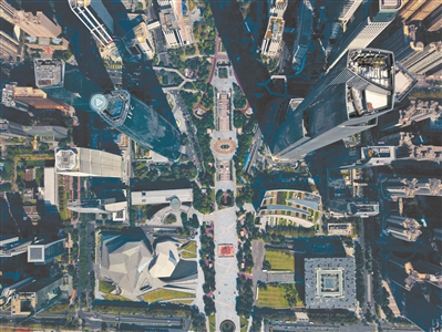 無人機飛過珠江新城上空,俯視東塔和西塔之間的噴泉小廣場。