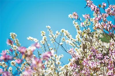 白色紫荊花在藍(lán)天的映襯下如雪般潔白。