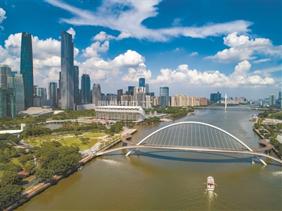 近日,廣州藍天白云相伴,大橋長虹臥波,倒映交融于珠江。