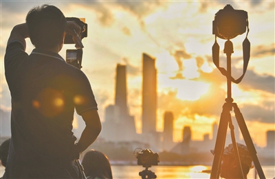 落日熔金,這幾天不少市民駐足珠江,捕捉金色浪漫瞬間。