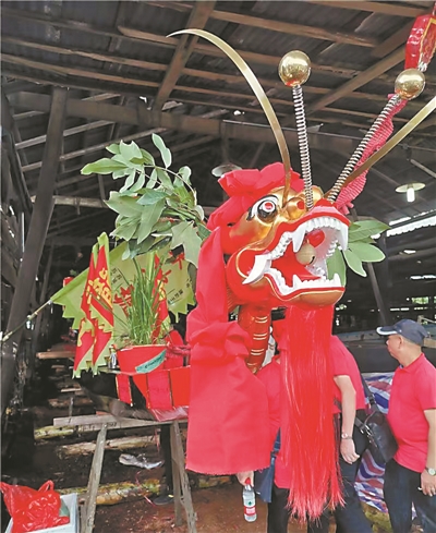 “加油!加油!”在指揮的奮力吆喝和“咚咚”的鼓點聲中,一條長度接近40米,龍頭艷麗、全身烏黑的傳統龍舟,在村民齊心協力推動下,緩緩滑入水中。