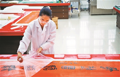 修復完畢,書畫修復師畢佳揭去書法家吳昌碩篆書八言聯的保護膜。