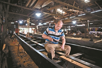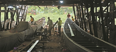 新“東坡號”全部用上好的坤甸木打造。3月19日,上漖村龍船廠的工人正在加班趕制新“東坡號”龍舟。