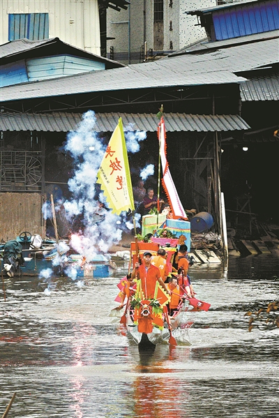 遵照傳統,車陂族人將龍牌、鑼鼓、羅傘等逐一安放好后,德高望重的長者主持進行了祈福、祭拜、采青、點睛等一系列傳統儀式。在鞭炮聲中,70多名壯年漢子,喊著口號,將這艘5.5噸重的龍舟穩穩送入船廠前的河涌里,新“東坡號”成功駿水。扒丁上船,在船廠前的河涌里來回劃行三趟,向上漖龍船廠表達謝意。