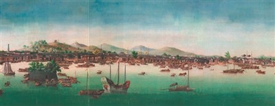 效果圖為清代彩繪絹本局部,該作品以全景紀實的方式生動再現了清廣州珠江灘的景觀