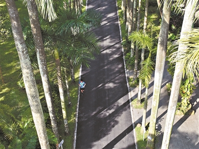 清晨,陽(yáng)光從樹(shù)叢中透出斑駁的樹(shù)影,市民在晨跑中開(kāi)啟新一天的生活
