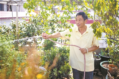 同樣在海珠區的自家天臺開辟綠地的還有退休老人黃盛林。與種植果蔬不同,作為海珠區莊頭村花農的后人,二十多年來,他所培育的素馨花開枝散葉,逐漸形成天臺上壯麗的“素馨花海”。每年的5月至12月是素馨花的盛開期,六旬老人黃盛林每天要花上數個小時在清香四溢的素馨園中忙碌。連日來,廣州市持續高溫。面對“大烤”,黃盛林每日在烈日下澆水三次,默默守護著天臺素馨花的裊娜與幽香,為了照顧它們,他已不記得自己多久沒有出過遠門,“它們好像給了我第二次生命”。