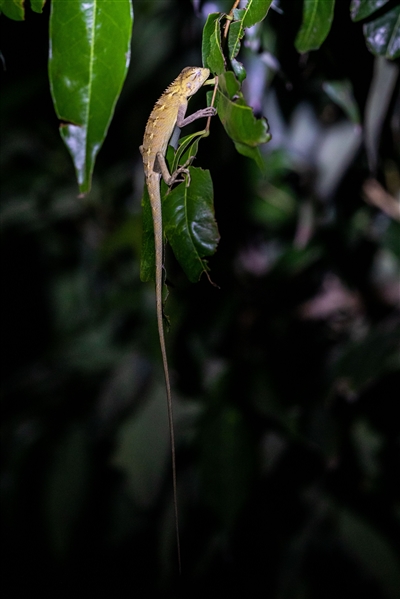 夜幕降臨,變色樹蜥安靜地抱握樹枝