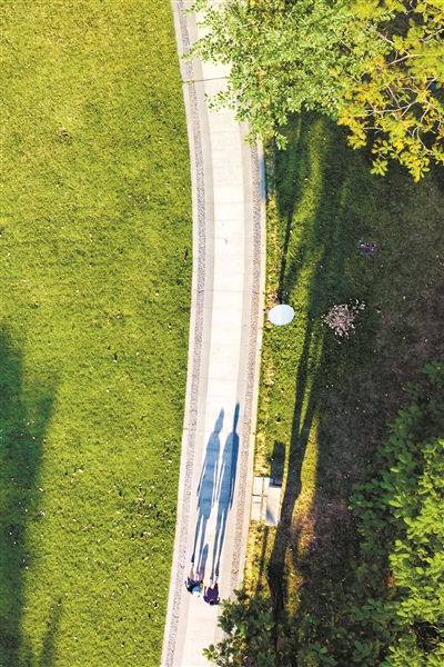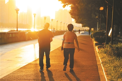 傍晚,市民在二沙島環(huán)島的綠道上散步。夕陽,把身影照得一片金黃