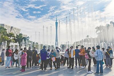 花城廣場被稱為廣州的城市客廳,春節前夕,廣場上的音樂噴泉表演吸引了數百位市民前來觀看。