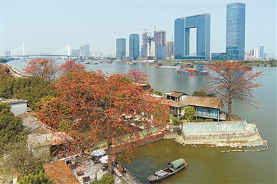 番禺區(qū)上漖珠江邊幾株木棉綻放,與廣州之窗商務(wù)港隔江輝映。
