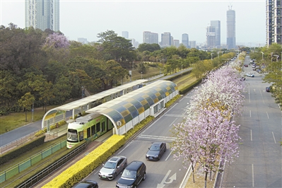 有軌電車(chē)駛過(guò)開(kāi)滿(mǎn)宮粉紫荊的琶洲塔站。