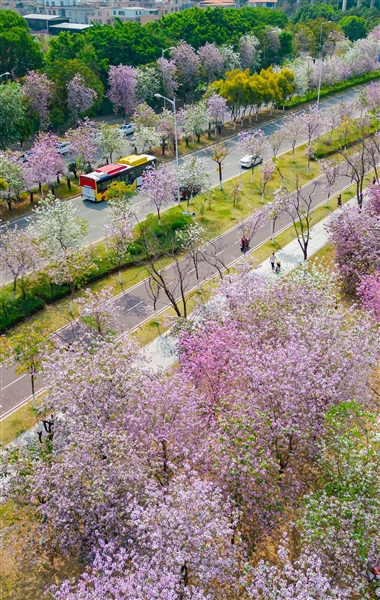 粉黛賞遍,還不能忘記那與春天最為適配的嫩黃色。洲頭咀公園旁的環(huán)島路,黃花風(fēng)鈴木已攀上枝頭、串串搖曳,惹得路人紛紛駐足,掏出手機(jī)拍個(gè)不停。這里是廣州有名的“網(wǎng)紅”景點(diǎn),不少市民成群結(jié)隊(duì),專(zhuān)門(mén)來(lái)打卡這枝頭的“黃精靈”,還有不少扛著專(zhuān)業(yè)設(shè)備的攝影愛(ài)好者,趕來(lái)為這滿(mǎn)園春色留下紀(jì)念。