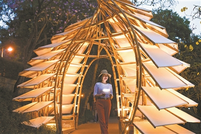 在麓湖公園分會場,多個竹藝展品甫一亮相,立即受到關注。現場不僅有中國國內多個城市的參展作品,還有馬來西亞、越南、泰國、印度尼西亞、老撾5個東南亞國家的優秀竹藝作品,打造“粵港澳大灣區·東盟國際高校營造大賽竹藝展”,彰顯灣區生態魅力和國際風范。作品用竹藝勾勒出不同的形狀,造型獨特,充滿美感。特別是入夜后,燈光亮起,竹藝作品與燈光相互交融,在夜色中呈現出不同的藝術造型,猶如湖面上的明珠。