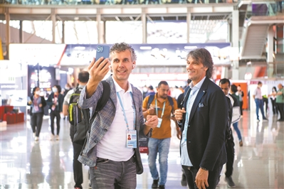 4月18日,境外采購商們笑容滿面,掏出手機合影留念