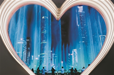 7月初,海心沙的音樂噴泉美輪美奐,吸引了許多游客駐足觀看。