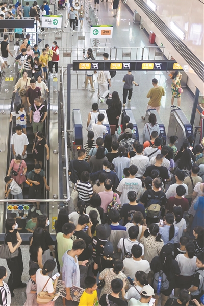 正值暑期,學生流、探親流、旅游流等客流量疊加,市民出行熱情高漲。7月以來,廣州的人流量陡然上升。廣州地鐵日均客運量已破千萬人次,城區地鐵站在非上班時段也上演“早高峰”“晚高峰”,中心地帶的站點更是提前限流。